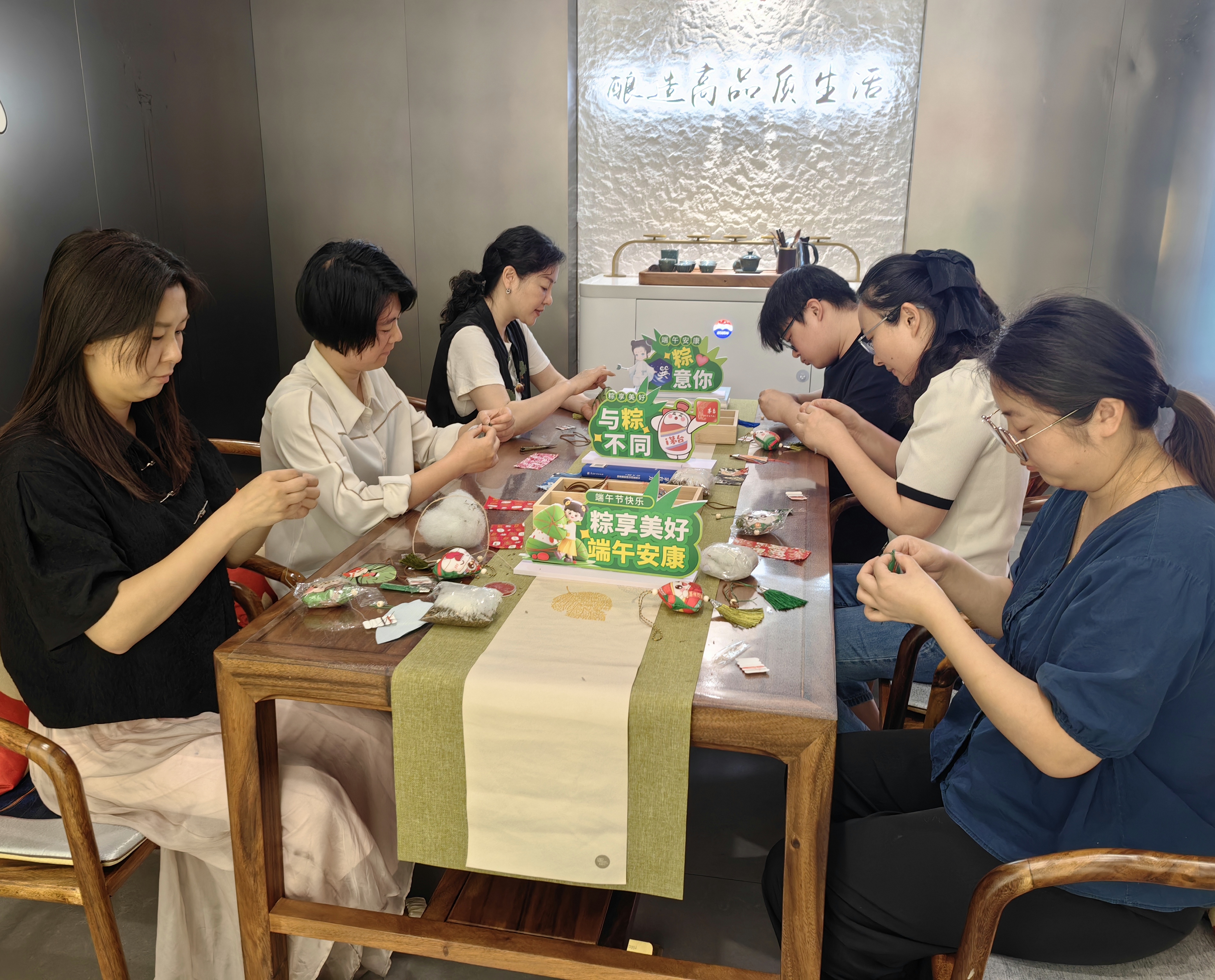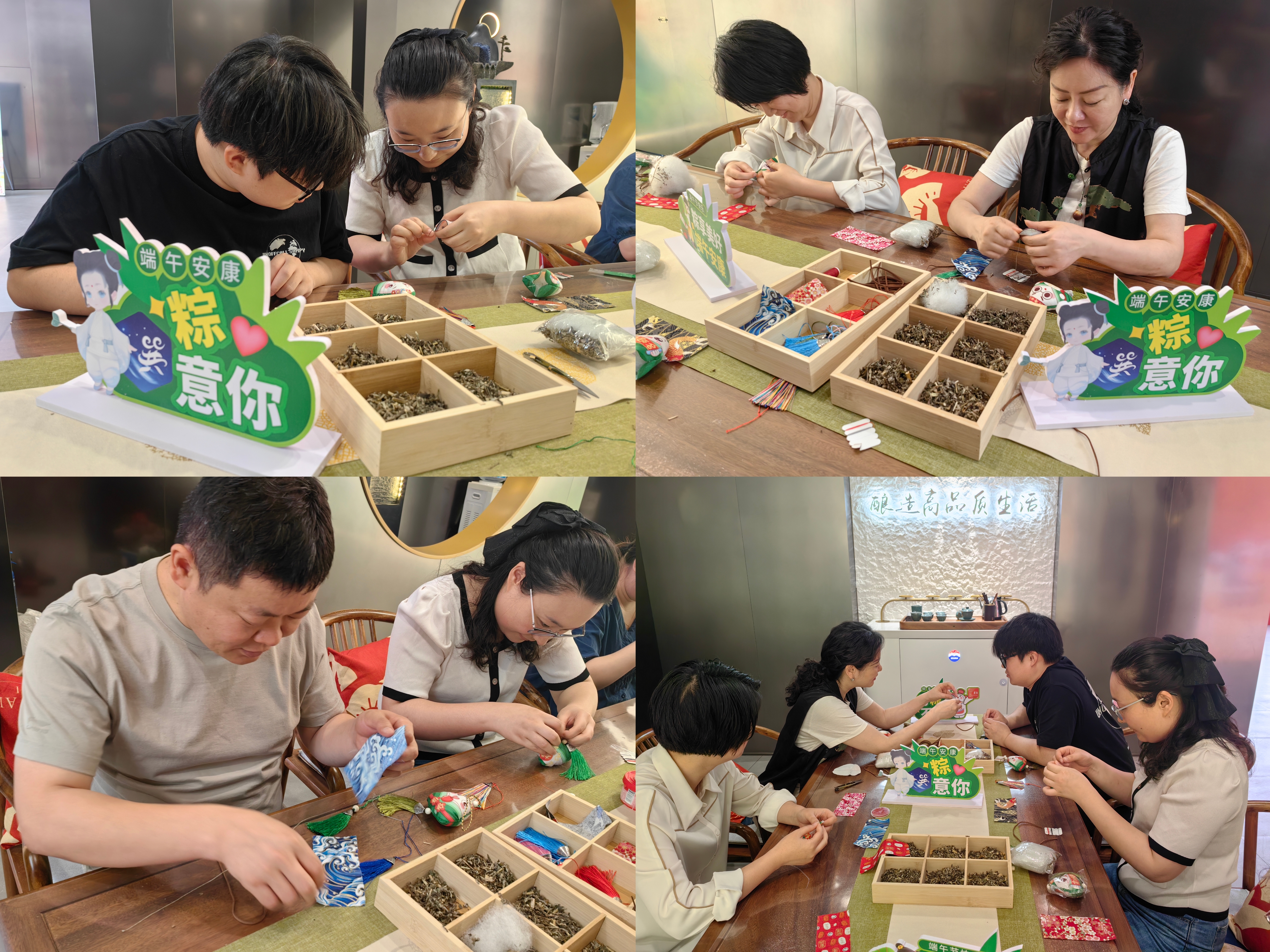 活動現場,桌上精美的布料、五彩的絲線、各種中草藥等材料一應俱全,大家各自挑選后,開始動手認真制作,一邊交流著端午節佩戴香囊的傳統意義,一邊探索著制作香囊的技巧,現場氣氛熱烈,不時傳來陣陣歡聲笑語。