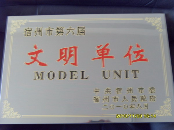 多年來,宿州公司十分重視文明創建和衛生工作,始終堅持圍繞中心促發展,注重民生促和諧的工作思路,各項工作呈現出創優爭先、你追我趕、蓬勃發展的良好勢頭。特別是公司搬遷到宿州經濟開發區新址后,公司領導以此次搬遷為契機,在開展文明單位創建和衛生先進單位創建活動中,廣泛、深入、扎實地開展工作,注重提高企業文明素質,改善企業衛生面貌,為促進企業發展發揮了積極作用,受到了宿州市委、市政府和相關部門的一致好評,經過專家組對申報資料的認真審核和現場檢查,宿州公司再次被授予“宿州市第六屆文明單位”和“宿州市衛生先進單位”光榮稱號。