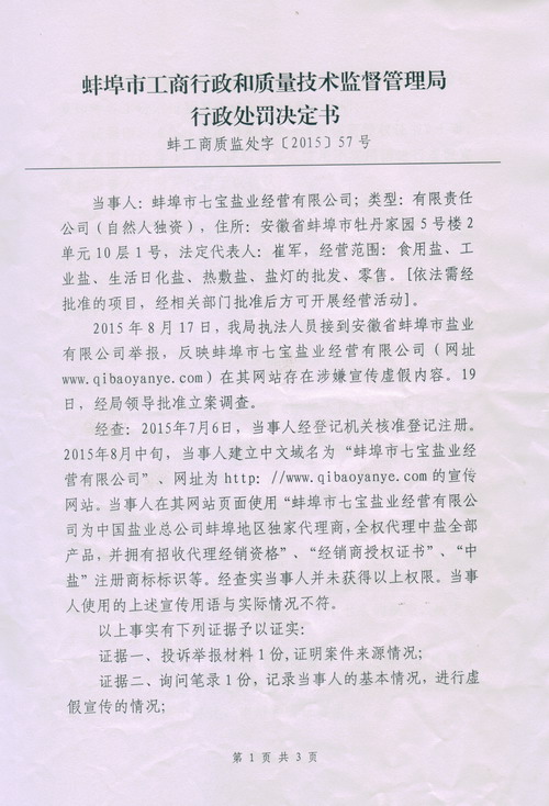 2015年7月6日,上述當事人經登記機關核準登記注冊蚌埠市七寶鹽業經營有限公司。8月中旬,當事人建立中文域名為“蚌埠市七寶鹽業經營有限公司”、網址為http://www.qibaoyanye.com的宣傳網站。當事人在其網站頁面使用“蚌埠市七寶鹽業經營有限公司為中國鹽業總公司蚌埠地區獨家代理商,全權代理中鹽全部產品,并擁有招收代理經銷資格”、“經銷商授權證書”、“中鹽”注冊商標標識等大量虛假宣傳廣告。