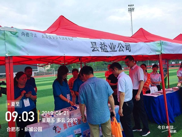 按照統一部署,6月21日早晨,長豐縣鹽業公司5名工作人員早早就來到了活動現場,帶著《食鹽專營辦法》等宣傳資料、品種鹽樣品及訂制的水杯參加宣傳活動。啟動儀式開始后,首先由縣政協副主席致辭;接著是合肥伊利乳業有限責任公司代表食品生產企業作承諾發言;最后由縣人大副主任宣布“長豐縣2019年食品安全宣傳周暨食品安全長豐行活動正式啟動”并會同場上領導共同按下儀式啟動球。活動現場人群涌動,氣氛熱烈,長豐公司5名工作人員穿著統一T恤,佩戴著工作證,分別在兩個展臺開展宣傳。主要宣傳《食鹽專營辦法》、講解多品種鹽知識,推崇“吃好鹽 選中鹽”,吃鹽首選“綠色食品鹽”的健康理念。