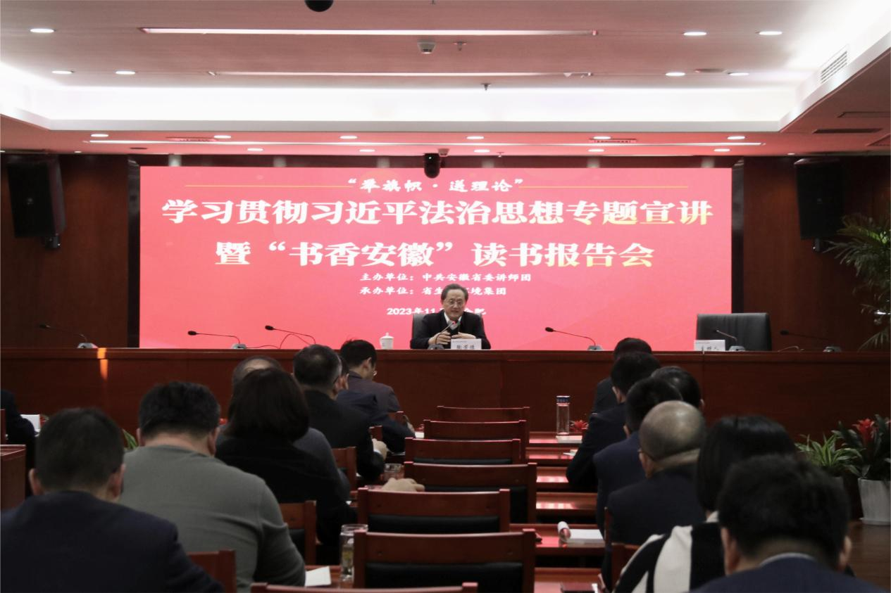 11月23日下午,省委講師團(tuán)“舉旗幟·送理論”學(xué)習(xí)貫徹習(xí)近平法治思想專(zhuān)題宣講暨“書(shū)香安徽”讀書(shū)報(bào)告會(huì)走進(jìn)省生態(tài)環(huán)境集團(tuán)。報(bào)告會(huì)邀請(qǐng)省人民檢察院黨組成員、副檢察長(zhǎng)、一級(jí)高級(jí)檢察官陶芳德作專(zhuān)題宣講報(bào)告。集團(tuán)公司黨委及經(jīng)營(yíng)班子成員,各直屬(控股)公司主要負(fù)責(zé)人、法務(wù)合規(guī)工作分管領(lǐng)導(dǎo)及部門(mén)負(fù)責(zé)人,集團(tuán)本部中層及以上管理人員參加報(bào)告會(huì)。
