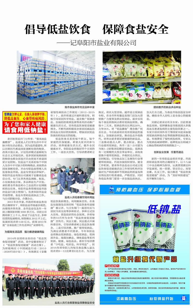 低鹽飲食關系到每個群眾、每個家庭的自身健康,希望大家共同參與活動,培養健康生活方式,提升全民健康水平。阜陽鹽業將做好四個方面的工作。一是加大宣傳,引導消費者樹立低鹽飲食新理念。利用媒體宣傳、在食鹽包裝袋及店面印制“低鹽飲食有益健康”提示語、與衛生部門一起進社區與居民當面交流等多種形式、多種方式加大宣傳,營造良好的社會氛圍,并將每年的10月作為全市“低鹽飲食促進健康”宣傳月,突出主題、突出重點開展科普宣傳,引導消費者樹立低鹽飲食理念。二是引導消費,推廣使用低鈉鹽。為滿足消費者不同需求,今年阜陽鹽業將推出低鈉菇鹽、綠色低鈉鹽、低鈉深井鹽、海藻加碘鹽、調味菇鹽等系列低鈉、健康、綠色鹽品,意在引導消費者“少吃鹽、吃好鹽,科學用鹽”,到2015年將阜陽人均每天食鹽攝入量從現在的9—12克降至6克左右。為方便購買,將在大型賣場、超市設立低鈉鹽專柜,在全市所有徽鹽連鎖門店加大營銷推廣力度普及供應低鈉鹽,逐步實現每個食鹽銷售網點都有低鈉鹽銷售。確保十二五末,低鈉鹽供應比例達20%,力爭35%,將“低鹽膳食”理念推廣到全社會。今后我市將在現有低鈉鹽的基礎上,加強新品研發,推動鹽品升級換代,培育出更多更好更健康的新鹽品。三是推動重點人群、重點職業、重點行業使用低鈉鹽。各市(縣)公司要為當地1-2家敬老院贈送低鈉鹽;選擇具有一定規模的大型企事業單位、高校食堂推介使用低鈉鹽,并做到定點供應,定時配送;引導食品加工及餐飲行業等使用低鈉鹽。四是加強組織領導,健全工作機制。要求各市(縣)鹽業公司成立低鹽飲食促進健康活動工作領導機構并加強對生產和流通環節低鈉鹽的質量及供應情況進行檢查通報,嚴格獎懲。同時各級鹽務部門要進一步加強鹽政執法,加大打擊力度,為食鹽市場創造安全環境,確保全市人民吃上安全放心的健康鹽。