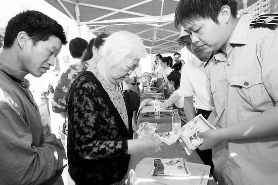 鹽政執(zhí)法人員向消費(fèi)者講解怎樣辨別真假食用碘鹽。515日是我國第18個(gè)“防治碘缺乏病日”,省有關(guān)部門在合肥舉行了宣傳活動(dòng)。(記者許昊攝)