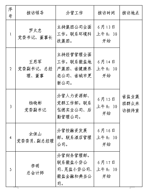 根據工作安排,現就省鹽業集團領導班子成員6月份接待省鹽業系統職工群眾來訪安排公示如下: