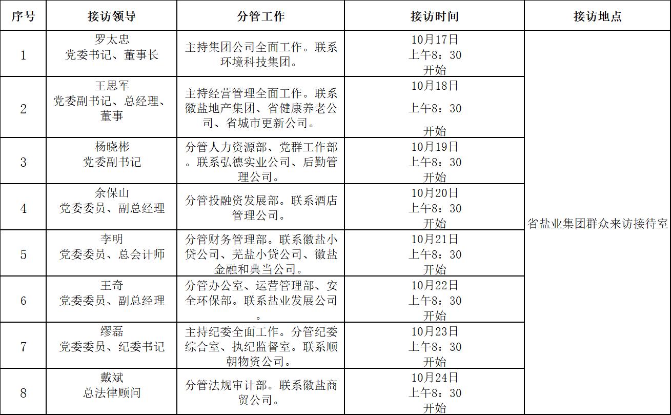 根據工作安排,現就省鹽業集團領導班子成員10月份接待省鹽業系統職工群眾來訪安排公示如下:
