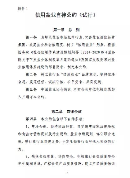 2017年11月6日,為規范鹽行業市場主體行為,營造鹽行業誠信經營氛圍,提高鹽行業社會信用度,中國鹽業協會制定《信用鹽業自律公約(試行)》。該《自律公約》從守法合規、確保食鹽質量與安全、防止安全生產事故、堅持誠信經營、開展誠信文化建設、設立誠信管理機構等6方面進行行業自律。各食鹽定點批發企業、食鹽定點生產企業和中國鹽業協會會員單位可自愿加入信用鹽業自律公約。