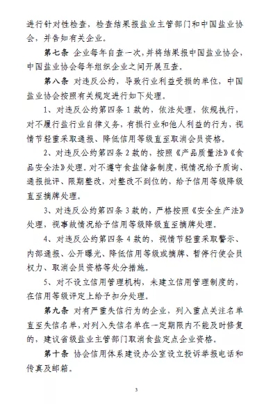 對違反公約第四條 1 款的(守法合規),依法處理,依規執行,對不履行鹽行業自律義務,有損行業和他人利益的行為,視情節輕重采取通報、降低信用等級直至取消會員資格。
