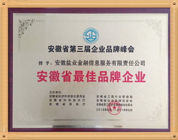 2016年6月18日,由安徽省經濟和信息化委員會、安徽省科學技術廳、安徽省商務廳、安徽省工商行政管理局、安徽省企業品牌促進會,共同舉辦的“安徽省笫三屆企業品牌峰會”在省人大會議中心舉行。安徽鹽業金融信息服務有限責任公司(簡稱徽鹽金融)榮獲“安徽省最佳品牌企業”獎項并受邀參加本次會議。