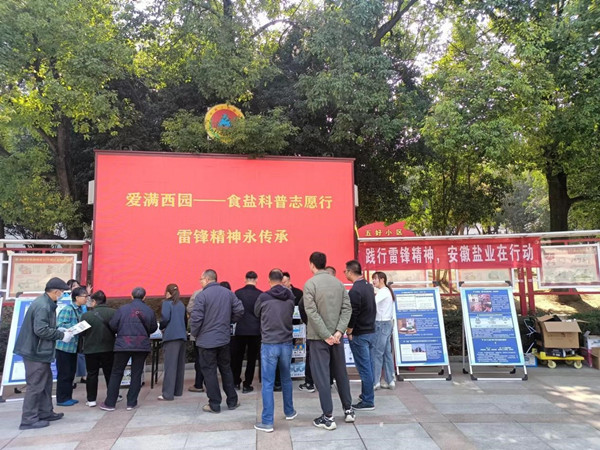 活動現(xiàn)場,通過擺放宣傳展架、低鈉鹽、生活用鹽展臺、懸掛“踐行雷鋒精神,安徽鹽業(yè)在行動”橫幅、大屏幕投放主題標(biāo)語等,營造了濃厚的活動氛圍。志愿服務(wù)隊向社區(qū)居民免費發(fā)放宣傳單頁、控鹽量勺、綠色低鈉鹽等物品,為居民如何健康用鹽答疑解惑,宣傳科學(xué)補碘知識,倡導(dǎo)低鈉飲食消費理念,贏得了社區(qū)居民廣泛好評。