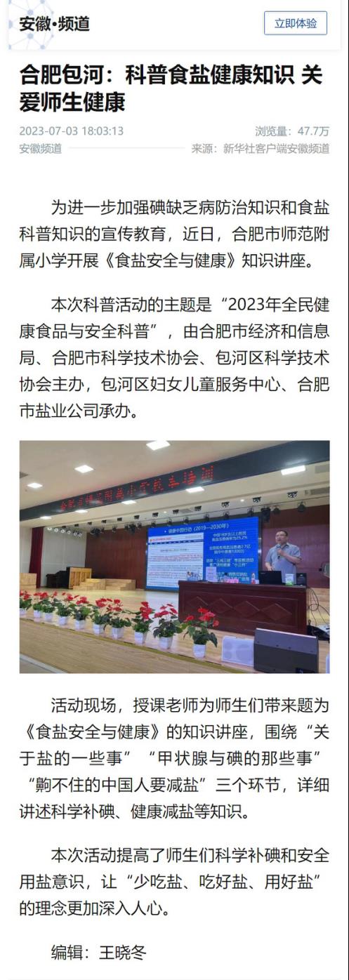 為切實(shí)做好黨的二十大精神宣傳貫徹工作,在習(xí)近平新時(shí)代中國特色社會(huì)主義思想指引下 ,進(jìn)一步樹牢以人民健康為中心的發(fā)展思想,合肥鹽業(yè)在合肥市師范附屬小學(xué)開展食鹽科普活動(dòng),為全校200余名師生普及科學(xué)補(bǔ)碘、健康減鹽知識(shí),關(guān)愛師生健康,推廣中鹽低鈉鹽,助力健康中國建設(shè),食鹽健康科普活動(dòng)得到新華社客戶端安徽頻道關(guān)注報(bào)道,截至發(fā)稿日總瀏覽量達(dá)47.7萬次。
