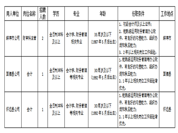 2、縣公司會(huì)計(jì):男女不限,全日制本科及以上學(xué)歷,年齡30周歲及以下,會(huì)計(jì)學(xué)、財(cái)務(wù)管理等相關(guān)專業(yè);1年以上相關(guān)崗位工作經(jīng)驗(yàn)者優(yōu)先。